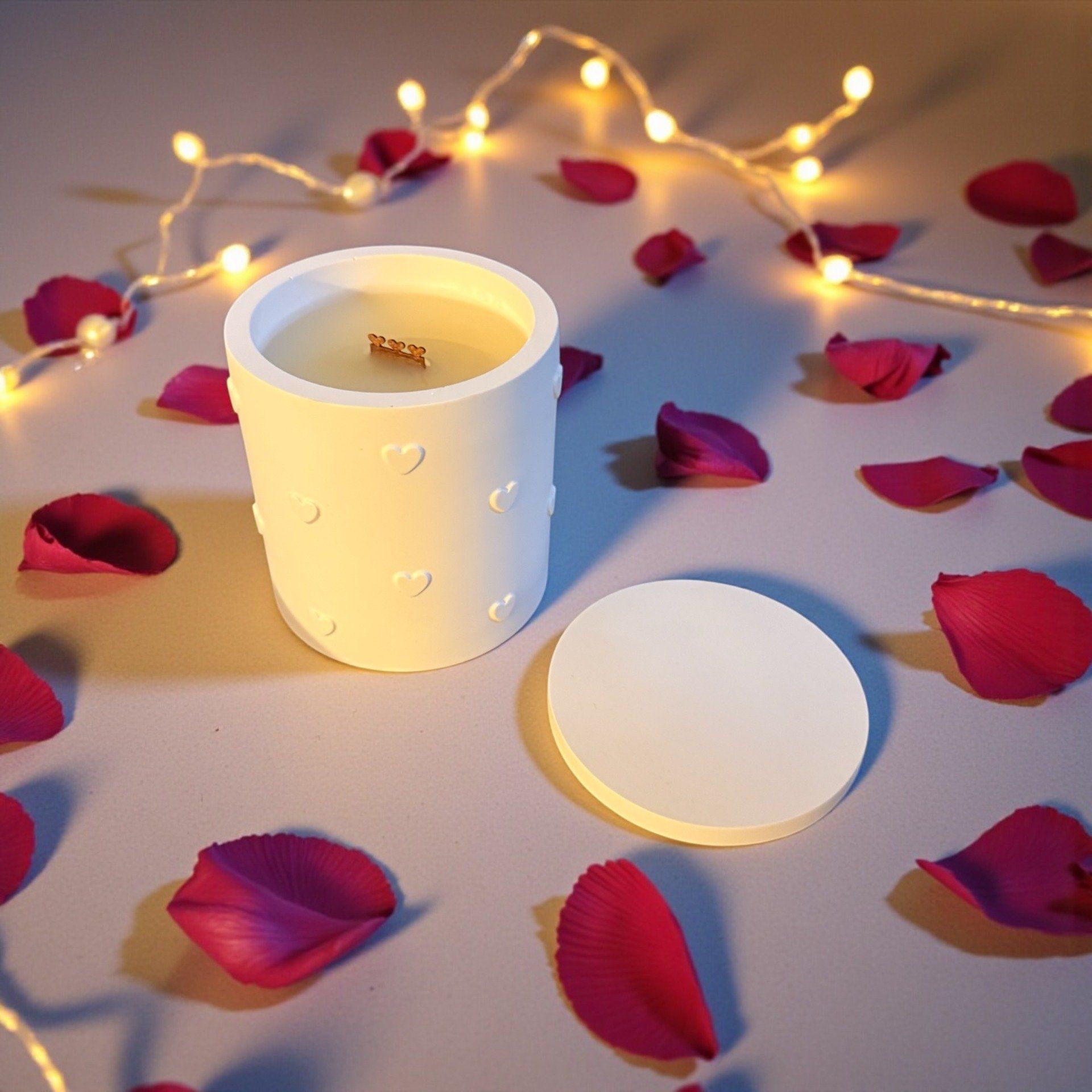 Cire de soja, parfum de Grasse, mèche en bois avec motifs coeurs.